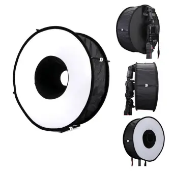 Provides large light sourceSoftbox easy to carryEasy fold designVelcro designElasticity Belt180 Degree Lighting Area This ring flash softbox is made of fabric and rods, collapsing much like a softbox. At 18" in diameter, the assembled softbox provides quite a large light source, especially when compared to alternative adapters. A ring flash is a donut of light that sits around the camera’s lens. Because the light comes from all directions, the shadows cancel each other out. A softbox works by making the light much bigger, thus softening the shadows it casts and flattering the subject.